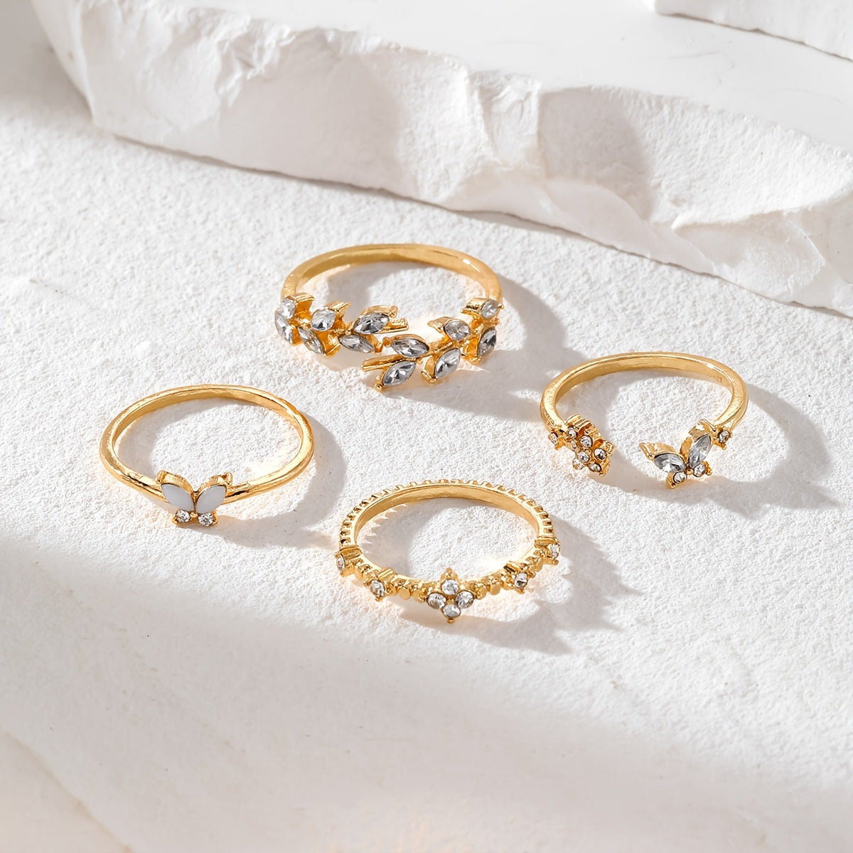 4pcs Elegant and Exquisite Y2K Style Sparkling Rhinestone Leaves Flowers Butterflies Women's Party Date Gift Daily Ring Combination