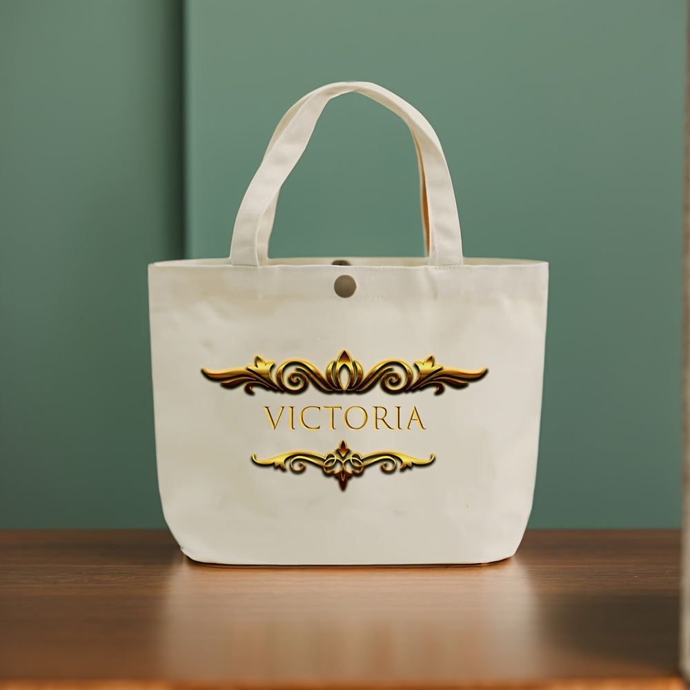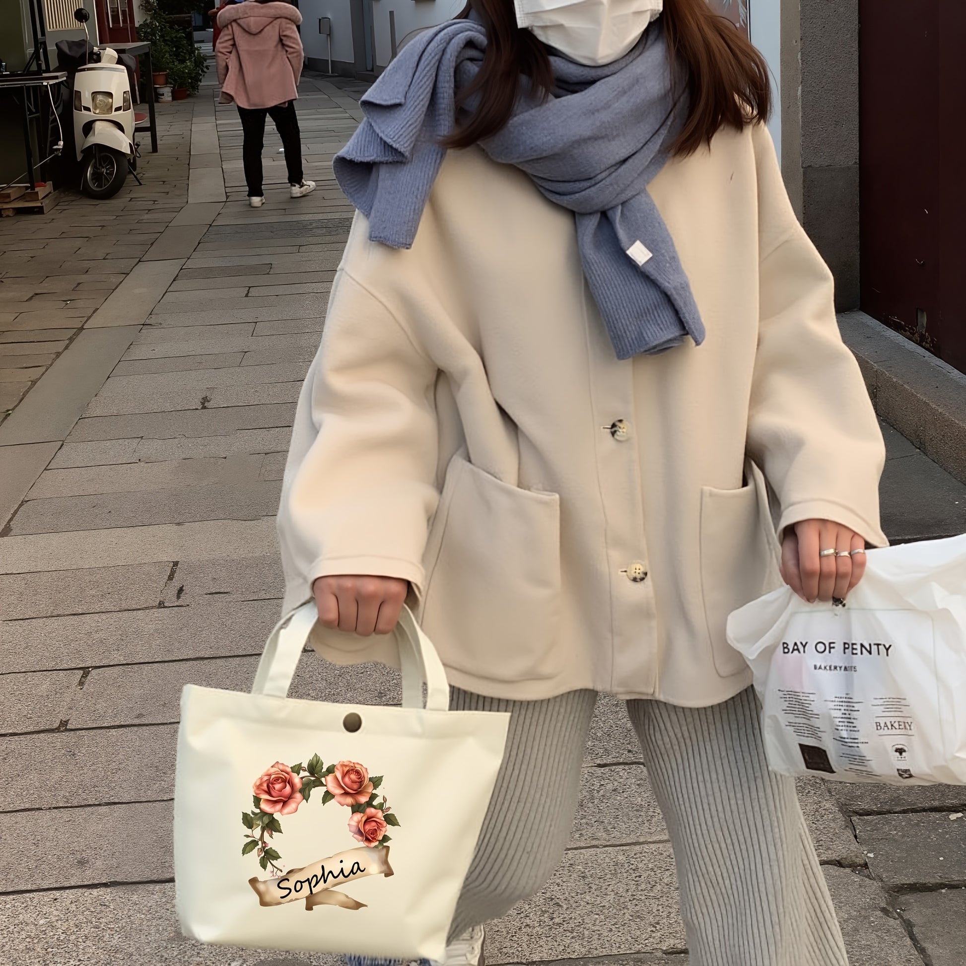 Customizable Canvas Tote Bag for Women - Personalized Mini Handbag with Button Closure, Black with Red Text, Perfect for Work, Commute, Shopping & Parties, Mini Purse